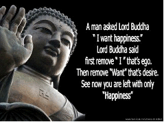 Kuvassa on aika hyvin pelkistetty Buddhan opetukset. Ensiksi on päästävä eroon egosta. Tässä hetkessä eläminen ja meditaatio ovat hyviä harjoituksia siihen. ”Halu” tarkoittaa samaa mitä minä edellä mielihyväohjautuvuudella. Ja sittenhän ei jää jäljelle kuin onni. ”Iisi biisi” sanoo juurilamani Rabsang. Noinkohan?
